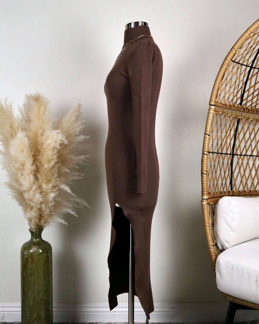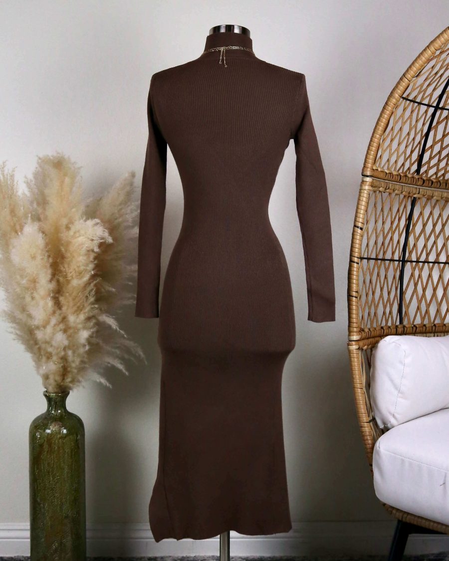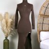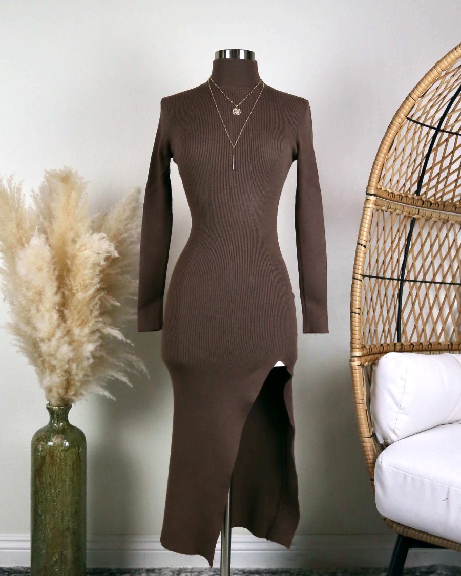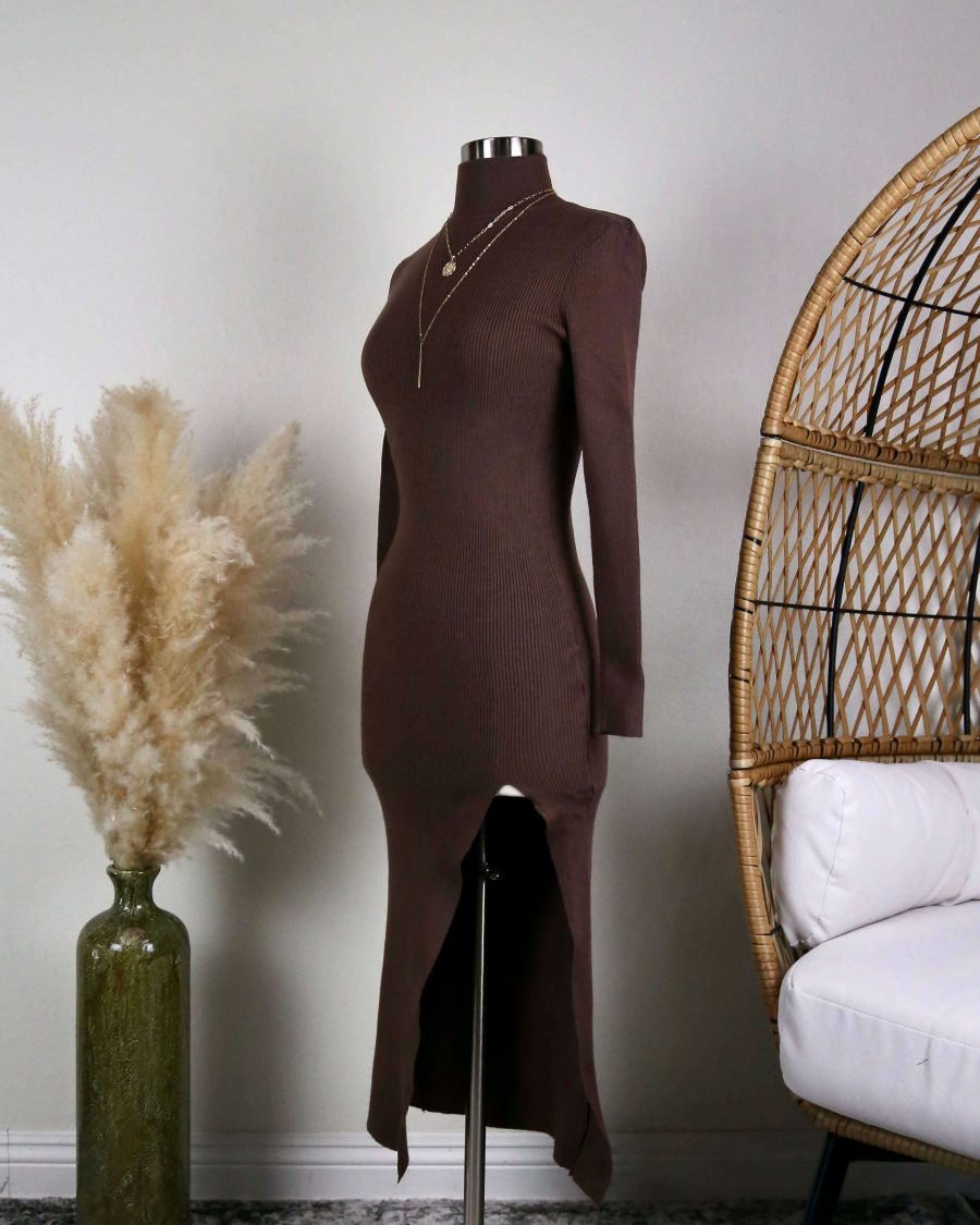 / Long Sleeve Ribbed Bodycon Midi Dress With Side Slit in Brown