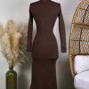 Long Sleeve Ribbed Bodycon Midi Dress With Side Slit in Brown